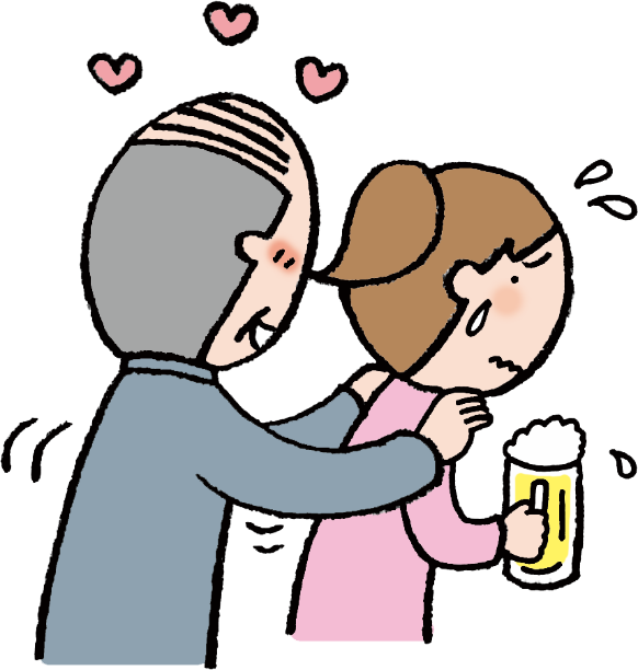 上司が毎回私の横に座り、お酌を強要し、私の体を触ってきます。イヤだけど、拒否したら仕事上でイヤがらせをされそうで、がまんしています。同じ職場の人は、私がイヤがっていることに気づいてくれません。